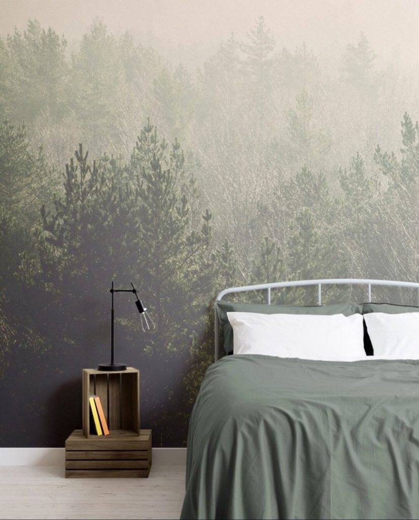 Drawing inspiration from the outdoors, this design uses shades of green to cultivate a serene retreat. A misty forest mural brings the essence of nature indoors, contrasting beautifully with crisp bedding and pale wooden floors. Rustic elements like a crate-style nightstand and exposed filament bulb lighting add subtle character. The deep green linens ground the space, making it a perfect haven for those seeking calm and simplicity. This approach highlights how natural tones can foster a peaceful, masculine environment.