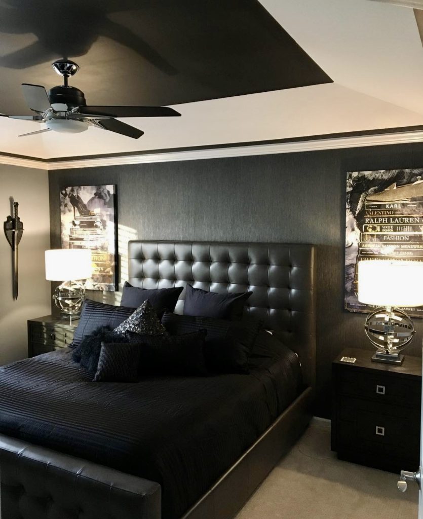 This space achieves a striking balance through the interplay of black and white, enhanced by subtle blue undertones. The tufted headboard and glossy surfaces lend a polished, luxurious feel, while layered pillows add softness. Metallic lighting fixtures and framed artwork elevate the room’s aesthetic, demonstrating how simple elements can create a bold statement. This design suits the modern professional who values both strength and refined elegance.