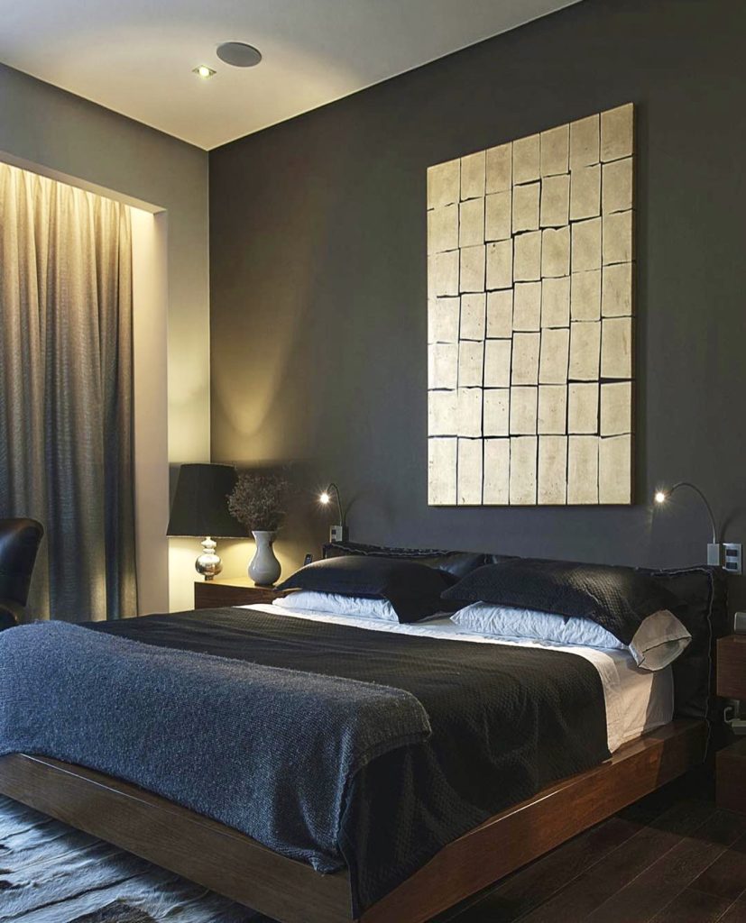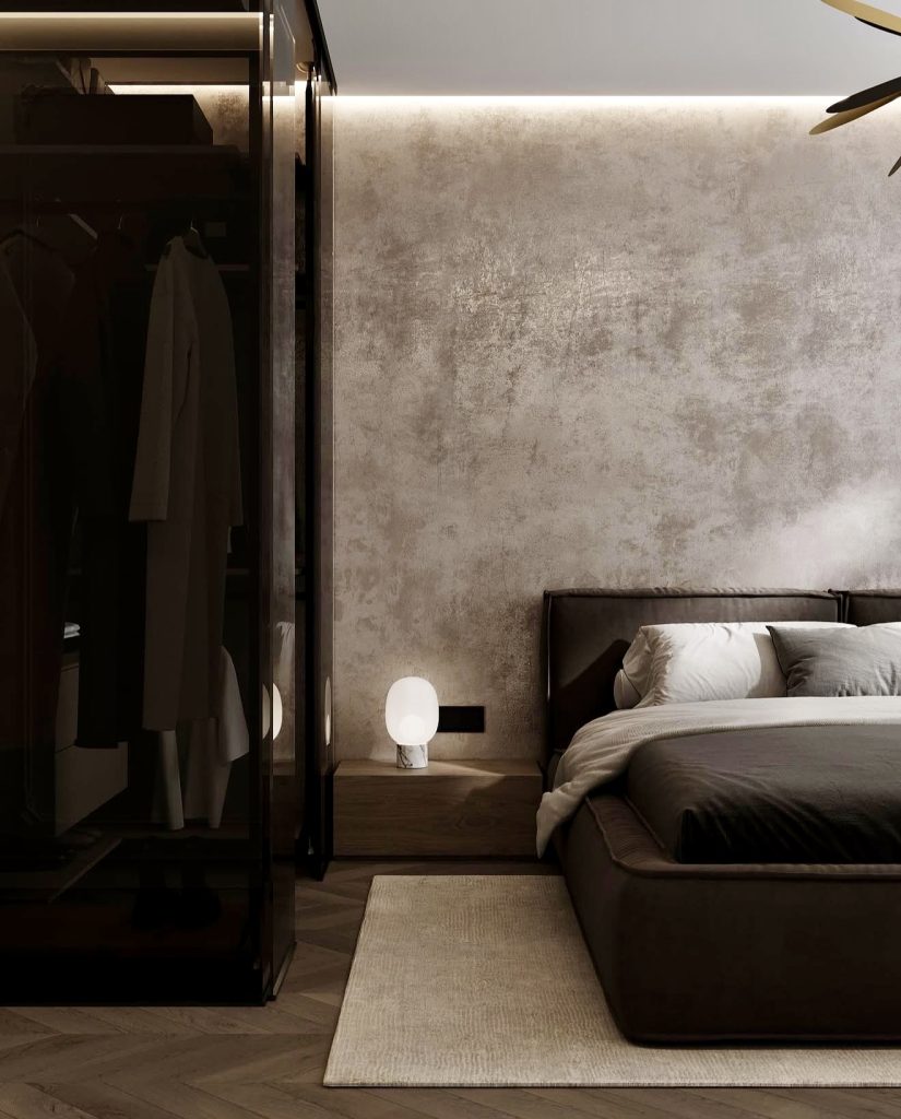 Dark greys and blacks come alive in this refined bedroom, where texture and lighting elevate the mood. The contrast between matte walls and a gilded art piece adds a luxurious touch, while sleek bedding and ambient illumination create a cozy yet mature atmosphere. This design dispels the myth that darker palettes feel cold, proving instead that with the right materials and tones, they can be inviting and elegant. It’s a style that resonates with confidence and timeless appeal.