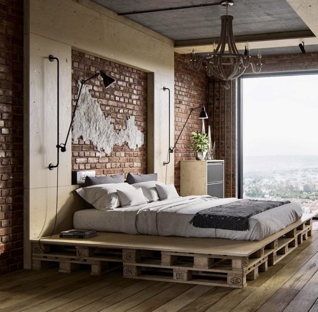 Utilizing reclaimed wood pallets and exposed brick, this bedroom channels a raw, creative energy. The rustic backdrop contrasts with minimalist bedding, while abundant natural light balances the darker tones. This handcrafted aesthetic is reminiscent of an urban loft or artist’s studio, blending rugged character with laid-back comfort. It’s an ideal design for those who appreciate authenticity and individuality in their living space.