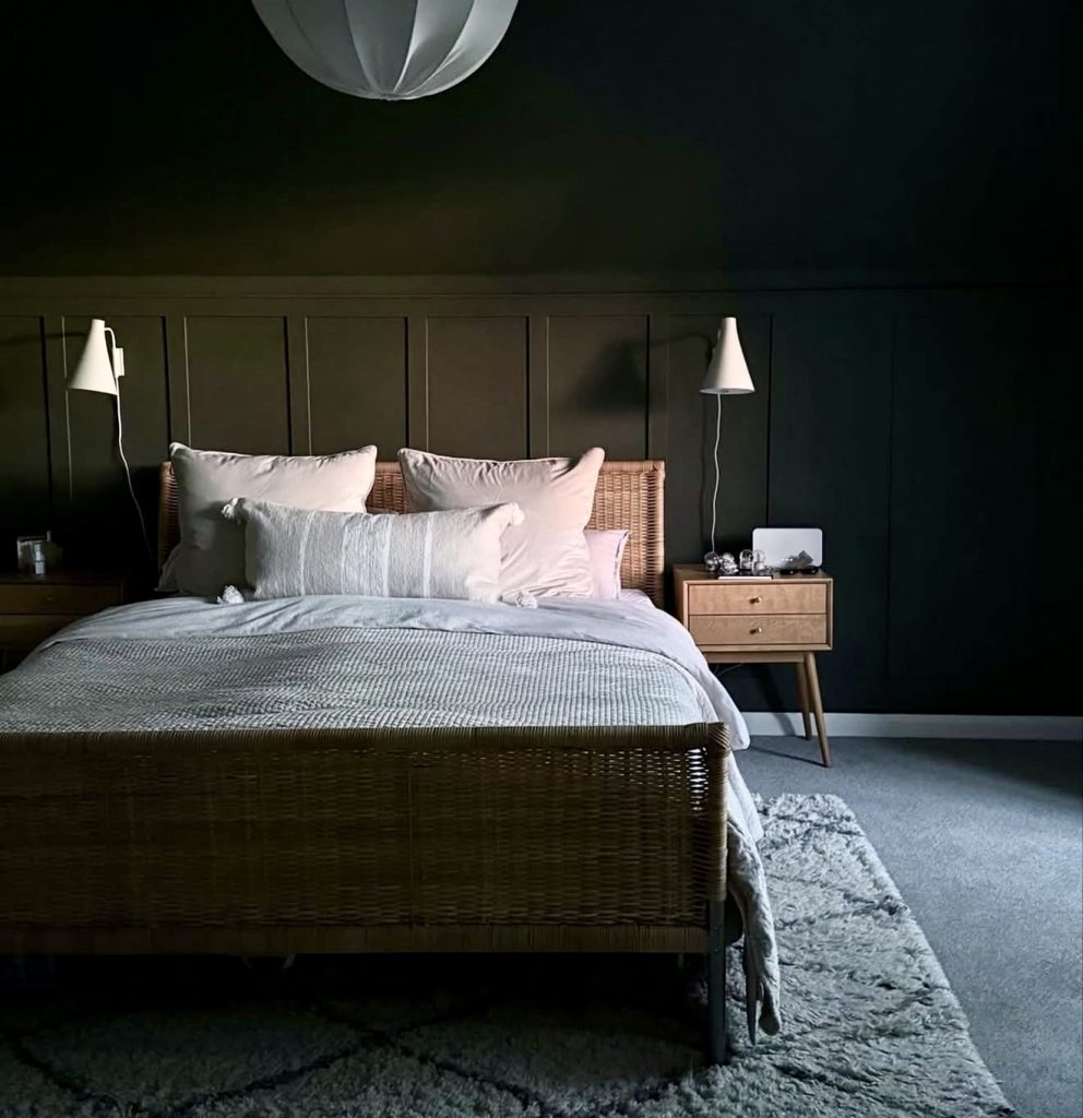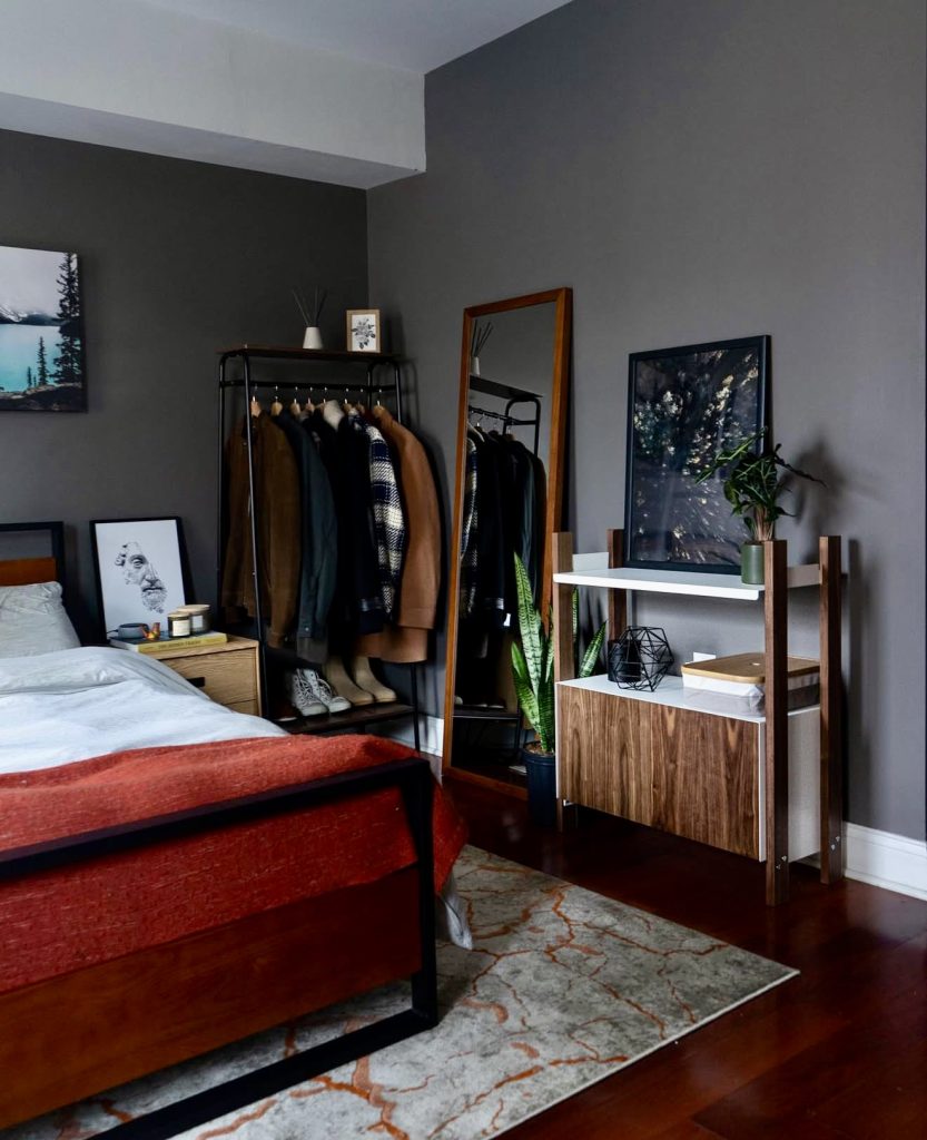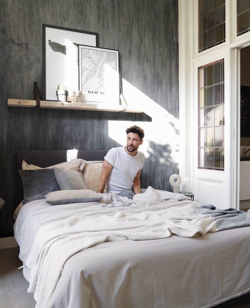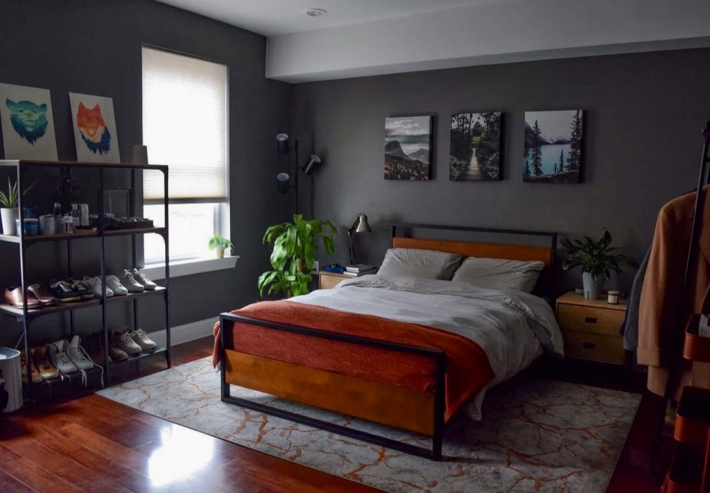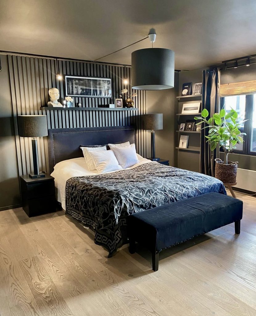 Combining rustic warmth with modern refinement, this bedroom features dark grey walls and natural wood accents that create a grounded, masculine atmosphere. The mix of metal frames, greenery, and textured fabrics adds depth and personality. Inspired by Scandinavian simplicity but with enhanced craftsmanship, this space is perfect for men who appreciate classic style reinterpreted with contemporary flair.