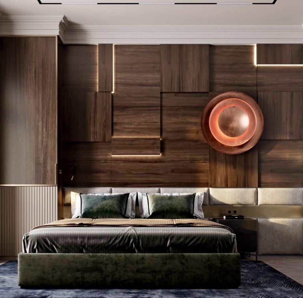 This sophisticated bedroom elevates earthy hues through rich wood paneling and bronze lighting. Dark green velvet cushions add a luxurious touch without overwhelming the space. The harmonious blend of blue accents and warm walnut tones creates a timeless, masculine palette. Subtle lighting highlights geometric wall panels, enhancing the room’s structured yet calming ambiance. It’s an indulgent retreat for those who appreciate thoughtful design and comfort.