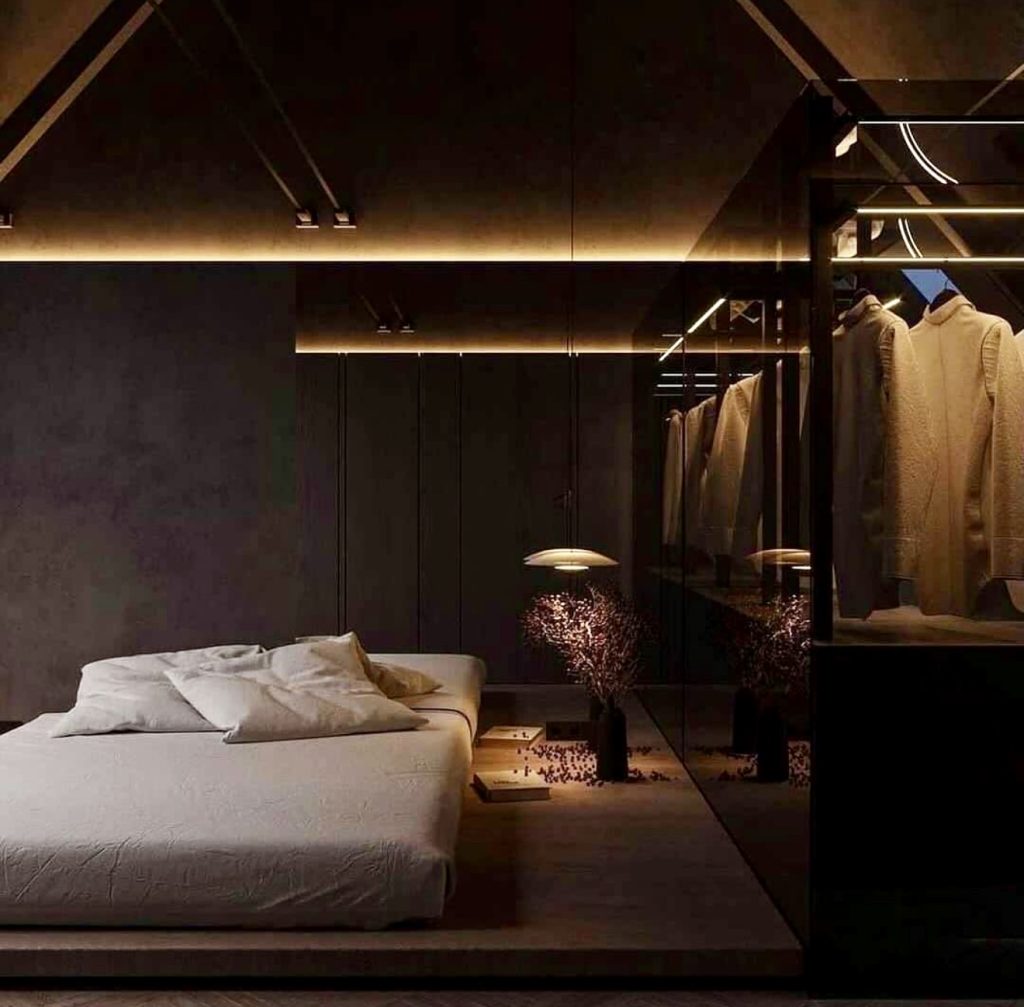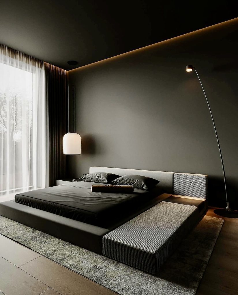Blending raw industrial elements with sleek modernity, this bedroom uses deep blacks and greys to craft a dramatic, cinematic atmosphere. Concealed lighting softens the dark surfaces, creating an intimate, meditative space. Reflective glass, minimalist furniture, and tactile fabrics balance shadow and texture, resulting in a luxurious yet understated masculine interior. This design is ideal for men who value quiet strength and refined simplicity.