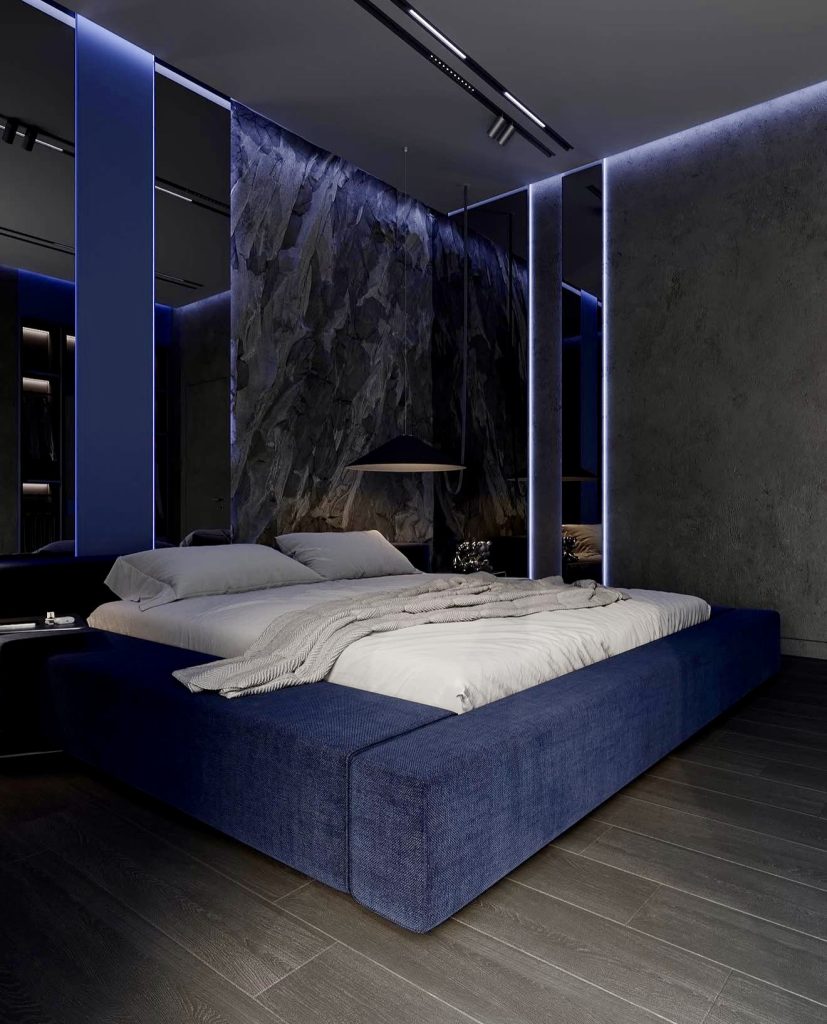 Featuring a cool blue palette, this bedroom reimagines masculine design with a futuristic yet intimate feel. A textured stone wall contrasts with sleek reflective panels, adding depth and dimension. Soft LED lighting outlines the space, balancing dark sophistication with gentle illumination. The navy fabric bed anchors the room, complemented by understated grey flooring. This daring design proves that minimalism can be both elegant and powerful.