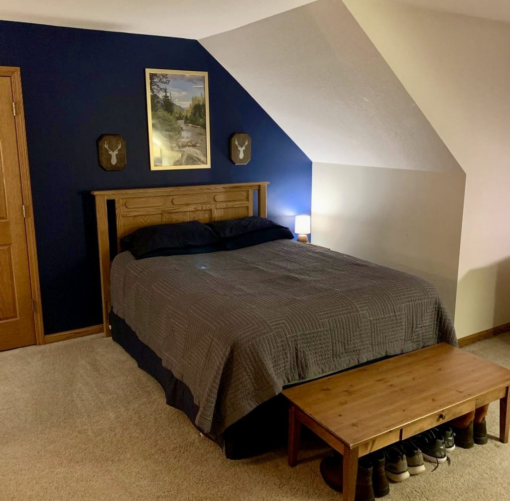 Warm wood furnishings paired with a bold navy accent wall create a quietly rustic yet timeless bedroom. White walls and natural textures balance the space, offering an authentic, unpretentious vibe. Muted grey bedding ties the look together, while soft lighting adds a cozy glow. This design is perfect for those who prefer understated charm over flashy decor.