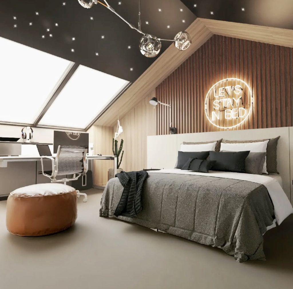 Natural light floods this loft-style bedroom through skylights, highlighting its minimalist design and practical layout. Light wood paneling and neutral tones create a calm, inviting atmosphere. Personal touches like a neon sign and subtle black accents add character without overwhelming the space. This room perfectly balances individuality with contemporary simplicity.