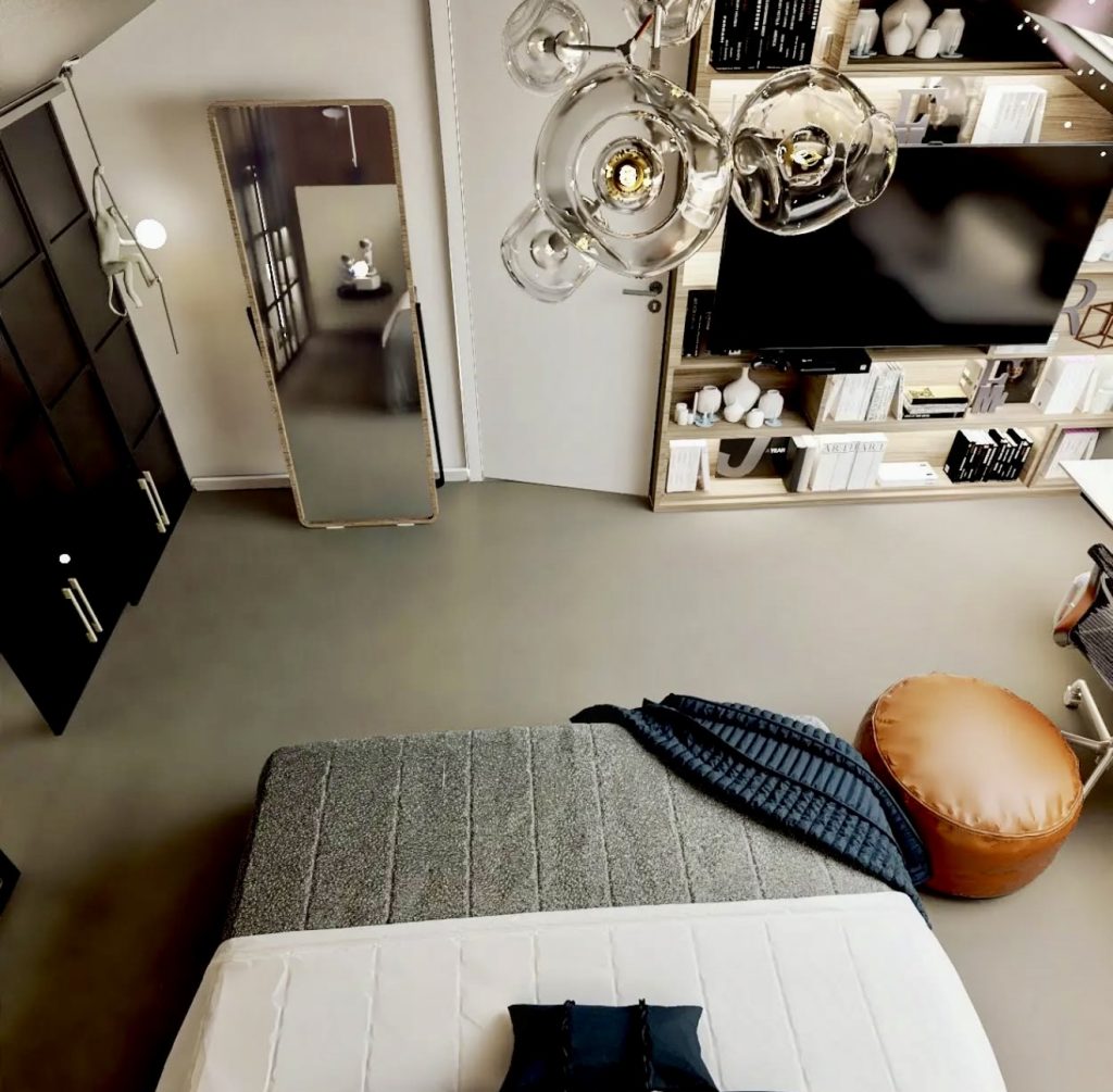 Minimalism meets industrial edge in this bedroom, where soft grey tones, clean lines, and graphic pendant lights create a sleek, cinematic feel. Reflective black panels add depth, while structured textiles and a low bed ensure comfort. This space exemplifies the fusion of architectural precision and emotional warmth.