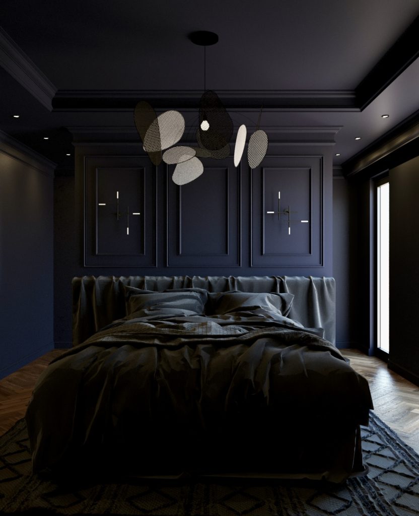 With a palette dominated by deep navy and layered textures, this bedroom exudes refined sophistication. Geometric lighting fixtures add a contemporary edge, while soft shadows create a moody, cinematic feel. Subtle molding details blend classic and modern elements, making this a masculine space that commands attention through understated elegance.
