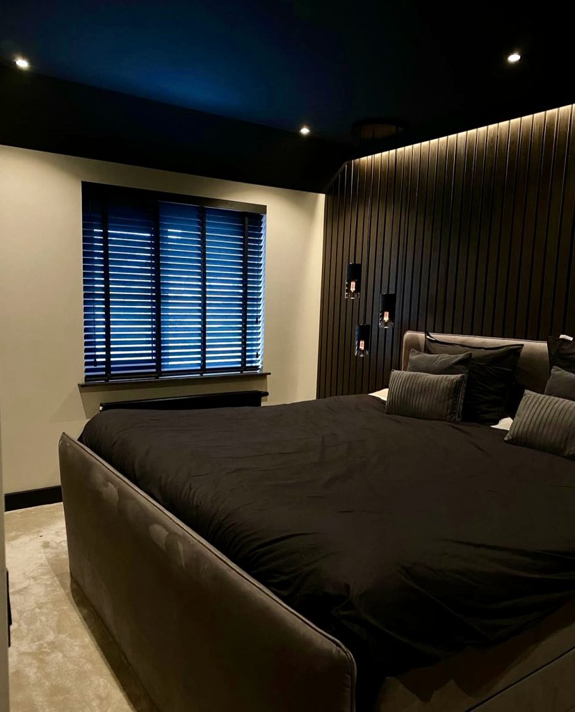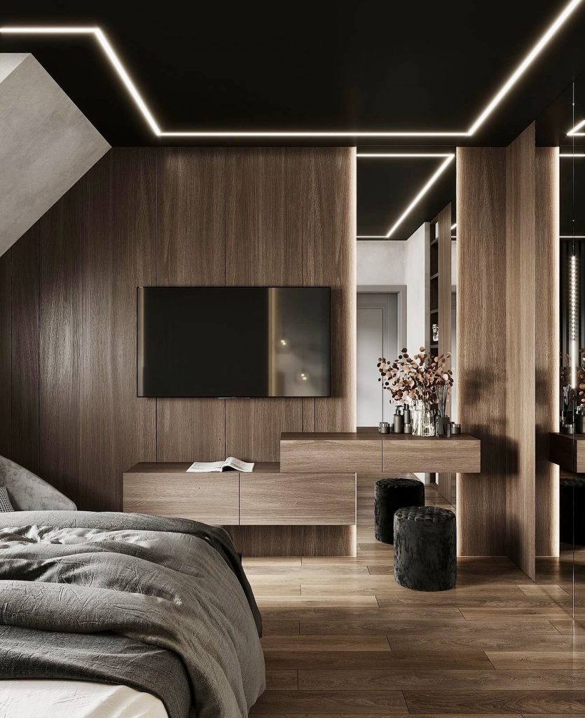 Warm wood grains contrast with a black ceiling and sharp LED lighting to create a masculine space with architectural rhythm. The muted bedding and soft textures add comfort to the minimalist design, making it ideal for those seeking a balance between structure and serenity.
