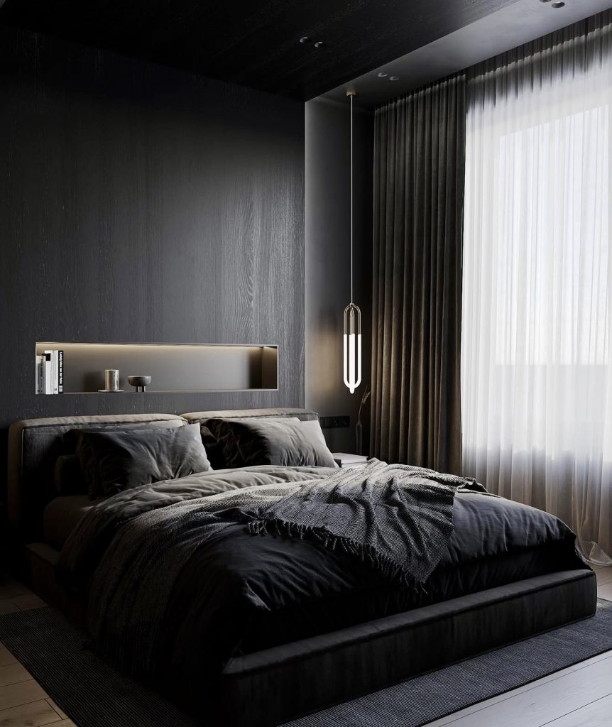 Matte black walls and ceilings envelop this bedroom in a sleek, futuristic cocoon. A single pendant light and white curtains provide contrast, emphasizing the minimalist ethos of purposeful design. This space reflects calm confidence and impeccable taste, perfect for those who appreciate refined simplicity.