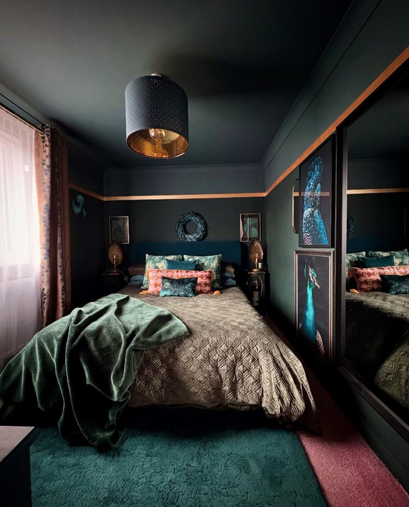 Dark green walls paired with rustic textures and jewel-toned accents create a dramatic, luxurious bedroom. Metallic details and dynamic lighting add depth, while teal, gold, and terracotta hues enrich the palette. Velvet cushions and rich wall art complete this bold, confident space that celebrates creative masculinity.