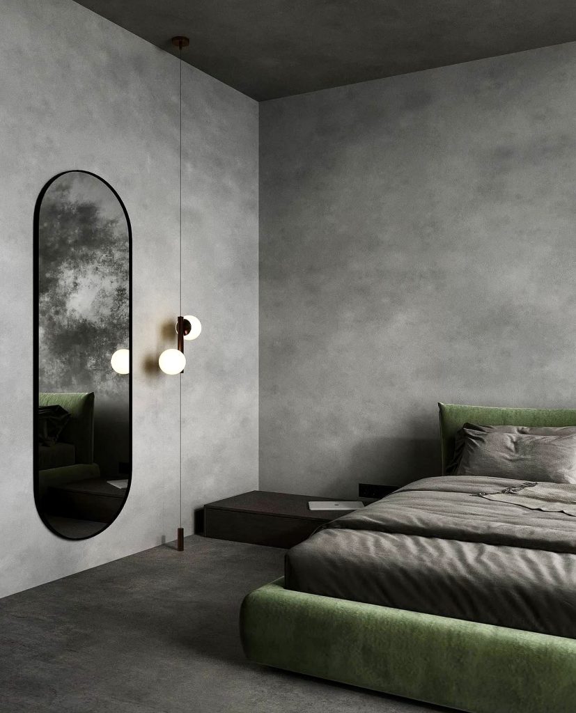 This minimalist bedroom uses soft grey walls and concrete textures to create a calming environment. A muted green bed frame adds a fresh pop of color without disrupting the serene vibe. Sculptural lighting and an oval mirror enhance the design’s elegance, demonstrating how green tones can invigorate minimalist interiors with subtle style.