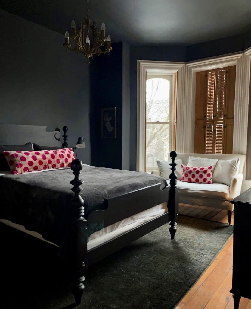 Dark navy walls and warm wooden shutters evoke timeless charm, while an ornate chandelier adds luxurious warmth. Vibrant cushions break the dark palette, and black-and-white contrasts inject modernity. This bedroom is a sophisticated retreat that blends history with contemporary style.