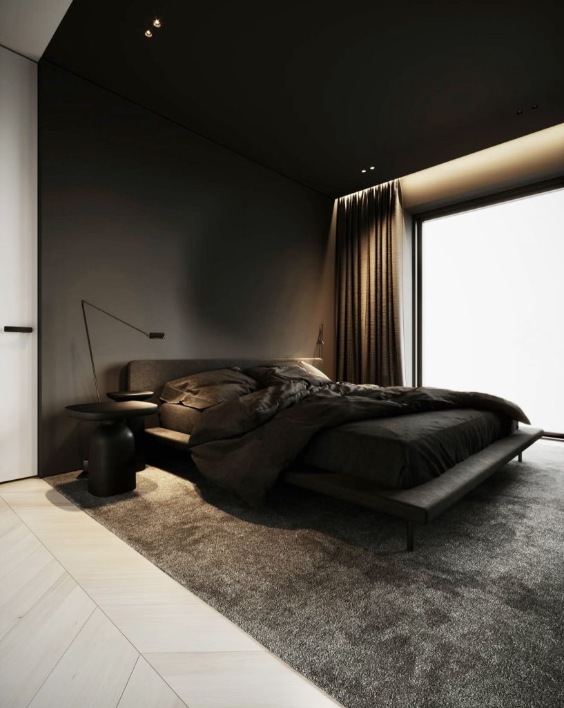 Soft ambient lighting complements the dark tones, creating a cocoon-like calm. A black ceiling and textured carpet enhance the intimate atmosphere, while sleek furniture defines clean silhouettes. The restrained black and grey palette keeps the room refined and cozy. Every detail, from minimalist nightstands to soft curtains, feels deliberate, embodying contemporary tranquility and confident simplicity.