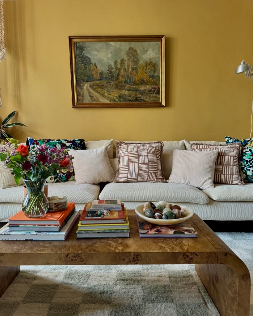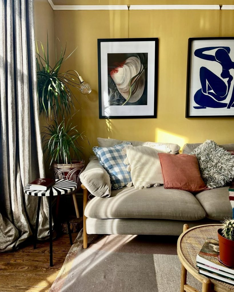 Vibrant yellow walls set a joyful foundation, enhanced by a thoughtfully curated mix of geometric and floral cushions that suggest a collection accumulated over time. A vintage painting mirrors the greens and grays of indoor plants, enriching the room’s creative and calming vibe. The coffee table, adorned with fresh blooms and neatly arranged decor, creates an inviting haven for art and book enthusiasts alike.