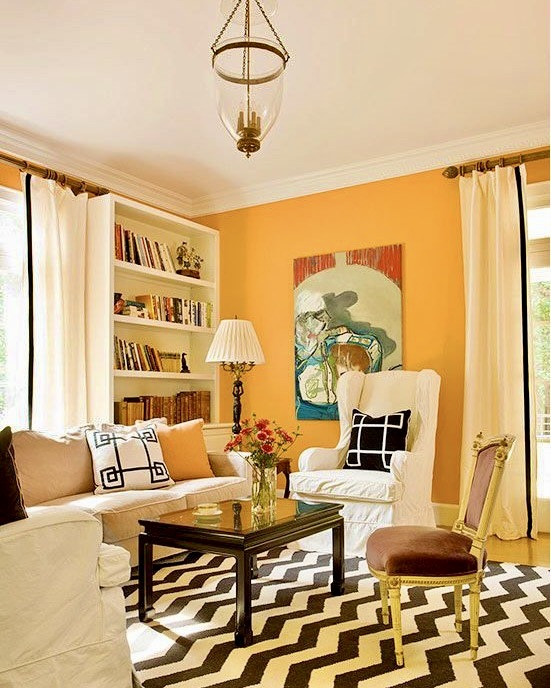 This lively living room radiates sunshine through its golden walls, paired with striking graphic elements. A black-and-white checkerboard rug introduces dramatic contrast, while crisp white curtains soften the windows. Mustard walls combined with black cushions create a fresh, gallery-inspired atmosphere, ideal for those who appreciate a blend of vintage charm and contemporary style.