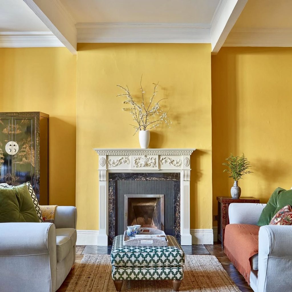 For admirers of traditional architecture seeking a modern refresh, this space pairs timeless white fireplaces with cheerful yellow walls. A green and cream ottoman introduces natural hues that harmonize with small indoor plants. The fusion of old-world elegance and contemporary comfort makes this room perfect for those who cherish character and coziness.