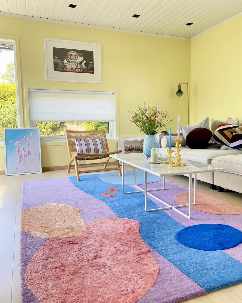 Stepping away from intense yellows, this pastel-inspired living room exudes a laid-back charm. The sunny walls serve as a neutral canvas for a rug adorned with abstract shapes in purple, blue, and pink, introducing subtle bursts of color. Accents in royal blue, burgundy, and gold provide contrast, while white elements maintain an airy, fresh ambiance—ideal for contemporary homes.