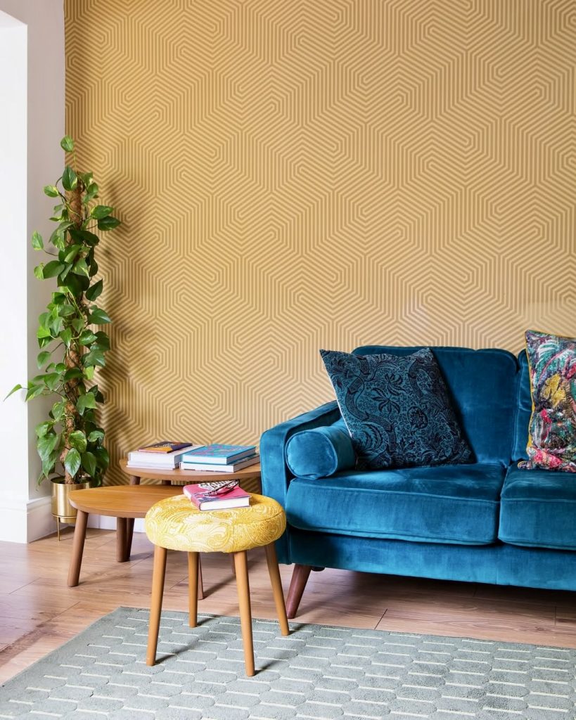 This living room blends retro allure with contemporary style through a velvet teal sofa set against honeycomb-patterned yellow walls. Striped wallpaper adds dynamic movement, while a round ottoman anchors the seating area. The interplay of two bold colors with wooden furniture crafts a chic and distinctive environment.
