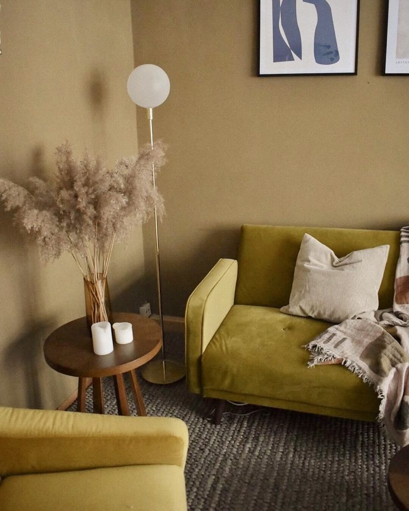 This serene living room features muted earthy yellow tones that foster calmness and clarity. Mustard green chairs, soft lighting, textured rugs, and dried pampas grass create a naturally warm and inviting environment. Neutral accessories and minimalist designs maintain cohesion, perfect for those who desire warmth without overwhelming color.