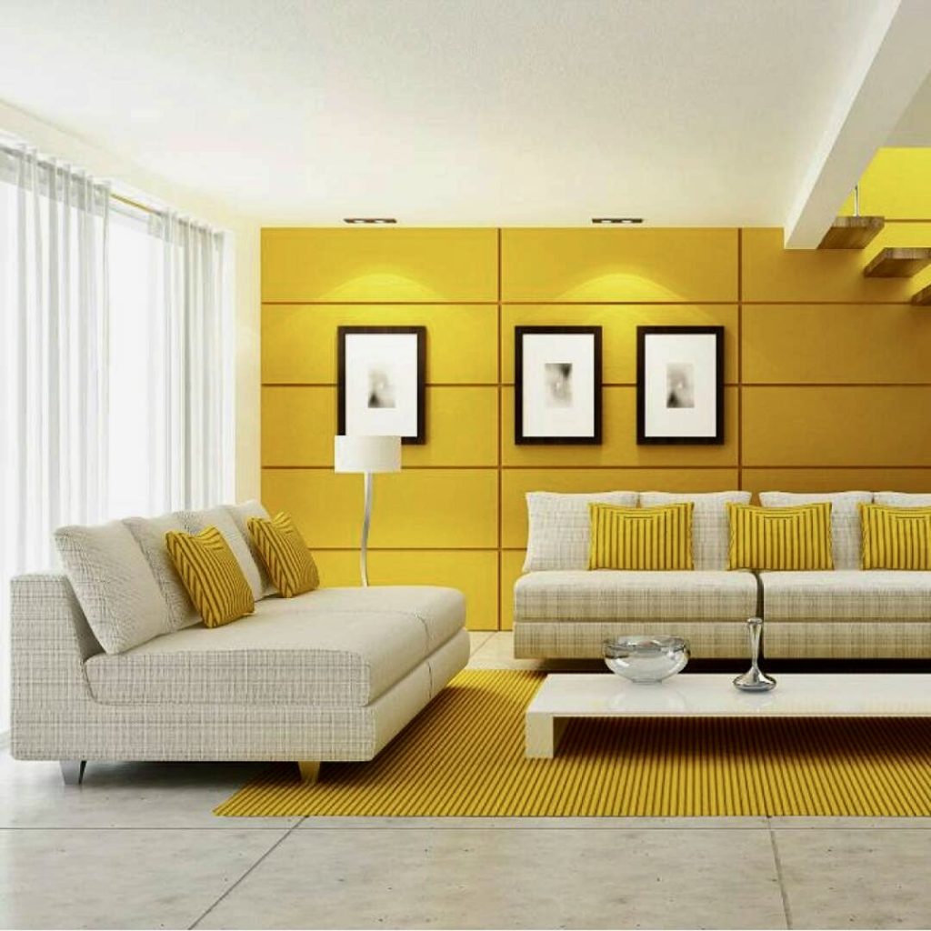 Featuring clean lines and a striking yellow paneled wall, this modern living room balances style and comfort. The streamlined sofa and minimalist coffee table are complemented by striped pillows and a golden rug, resulting in a polished yet playful environment. Ideal for those who favor light decor with a splash of vibrant color.