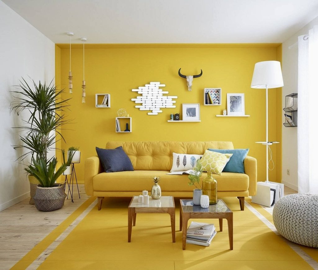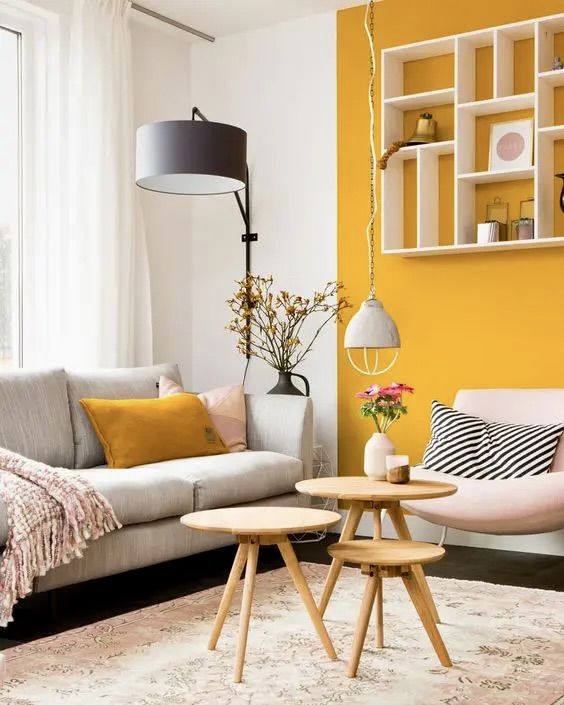 This lively room centers on yellow decor balanced by white shelving and framed art. A knitted basket and greenery add casual warmth, while navy and teal cushions elevate the style without overpowering the cheerful vibe. Its distinctive design makes it a standout choice for any home in 2025.