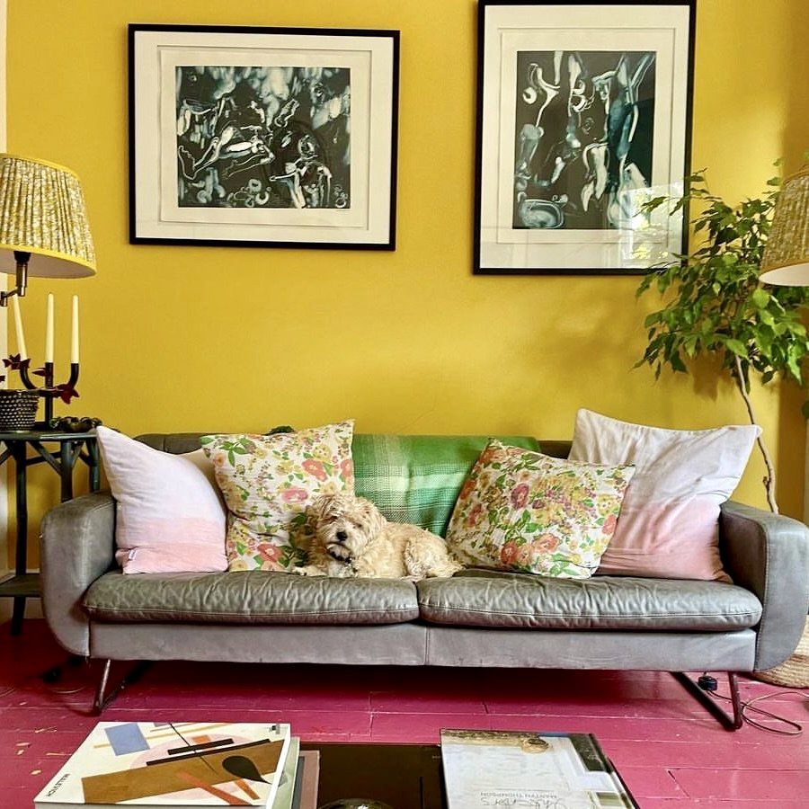 This living room artfully combines vintage floral elements with modern, vibrant decor. The contrast between a grey sofa and yellow walls is enlivened by cushions featuring soft hues and botanical patterns. A bold pink floor adds flair, complemented by botanical and abstract wall art. The space confidently merges eras and colors, creating a unique and inviting environment—approved by the resident dog, naturally.