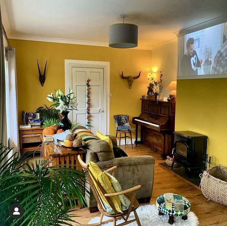 Golden yellow walls paired with vintage accents create a welcoming and relaxed atmosphere. Traditional elements like an upright piano and wood-burning stove blend with cozy knits and lush plants. This space feels perfect for intimate gatherings or quiet winter evenings with a warm drink and a good movie.