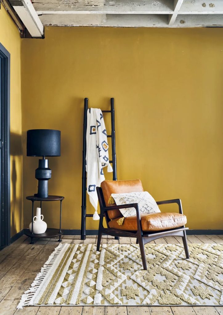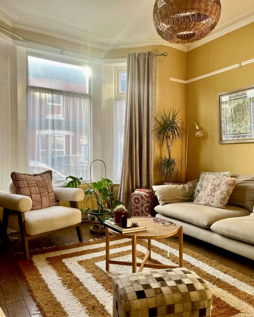 This snug bay window nook demonstrates how mustard shades can evoke a sense of nostalgia and grounded comfort. The walls, painted in a warm yellow, enhance the natural sunlight flooding the space, while a retro-inspired green pouf and mustard sofa add personality. A minimalist pendant light subtly elevates the ambiance without overpowering it. Complemented by wooden floors and mid-century modern furniture, the room exudes a serene and inviting atmosphere.
