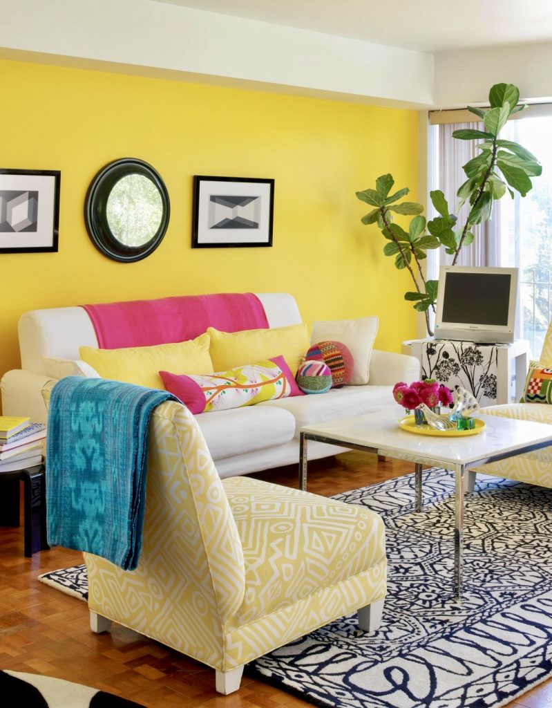 Bright yellow walls come alive with bold accents of hot pink, green, and blue. A black-and-white rug and circular framed art balance the vivid colors, preventing visual chaos. This design choice guarantees a lively and joyful everyday living space.