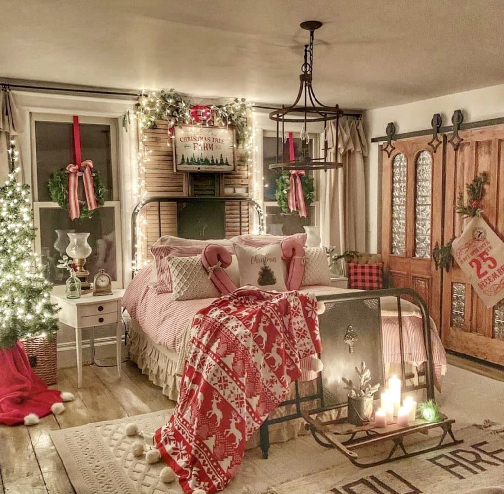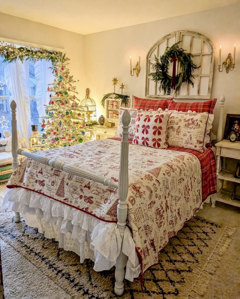 This bedroom captures the heart of traditional cottage Christmas style. Red festive patterns on quilted bedding set a joyful tone, while a fully decorated tree sparkles in the corner. A reclaimed window frame above the bed, adorned with a wreath, enhances the farmhouse aesthetic beloved by many. Personal touches like a handmade pillow cover or a printed quilt add warmth and character. This look demonstrates how simple DIY projects can turn your bedroom into a cozy winter wonderland without sacrificing comfort or style.