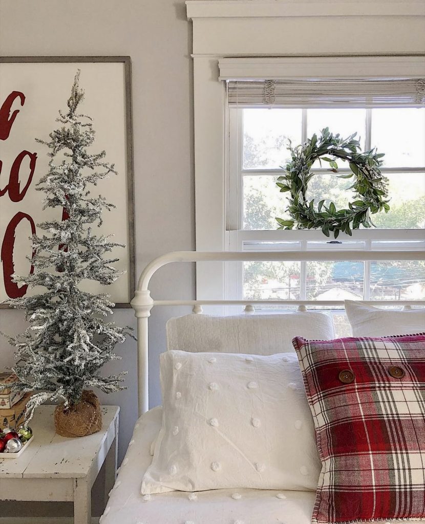 This bedroom beautifully showcases the charm of farmhouse decor. A crisp white bedframe, a snowy tabletop tree, and a plaid accent pillow combine to create a warm, inviting holiday atmosphere. A timeless green wreath on the window adds freshness and balances the view outside. This look is perfect for DIY enthusiasts who enjoy repurposing thrifted plaid fabrics or crafting homemade ornaments like painted paper decorations. It captures the cozy, welcoming feeling of a snug country inn during the holidays.