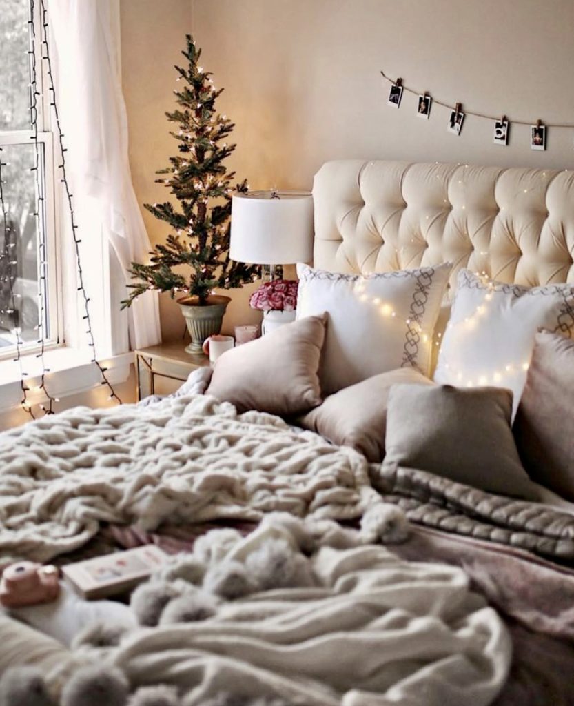 This style epitomizes understated comfort. A tufted headboard in soft neutrals paired with a chunky beige knit throw instantly evokes a cozy winter vibe. A petite evergreen in a simple pot, adorned with a ribbon, offers a charming DIY touch that fits perfectly in compact spaces. Crisp white linens keep the look fresh, while a gingerbread-themed pillow adds a subtle festive hint without overwhelming the room. A delicate wreath draped over the bed enhances the holiday spirit with simplicity and elegance—ideal for those who appreciate a warm yet uncluttered atmosphere.