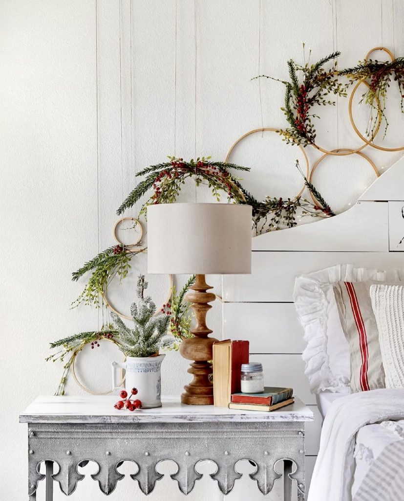 This concept celebrates farmhouse style with a crafty twist. A collection of embroidery hoops transformed into wreaths adds layered texture and character to the wall without overwhelming it. The nightstand features vintage books, a ceramic mug repurposed as a planter, and a mini evergreen tree, completing the look. This DIY project is both stylish and budget-friendly, perfect for those who enjoy thrifting and crafting. It’s a reminder that the most memorable holiday decorations often come from creativity rather than store-bought items.
