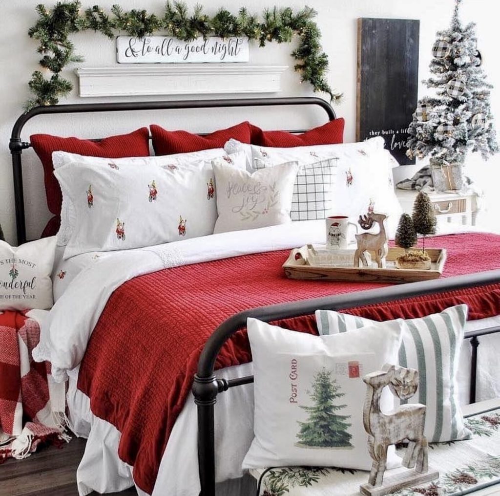 For those who love bold holiday colors, this bedroom embraces a vibrant red and white palette. From the festive bedding to the plaid throw, the space radiates cheer. A garland draped over the bed and a frosted tree in the corner anchor the design, while seasonal print pillows make the bed the room’s focal point. Black iron bedframes add contrast and sophistication, balancing the lively colors. This look is easily customizable—simply swapping pillow covers or throws can refresh the vibe. It’s a perfect choice for anyone eager to fully immerse in classic holiday spirit with a fun, energetic twist.