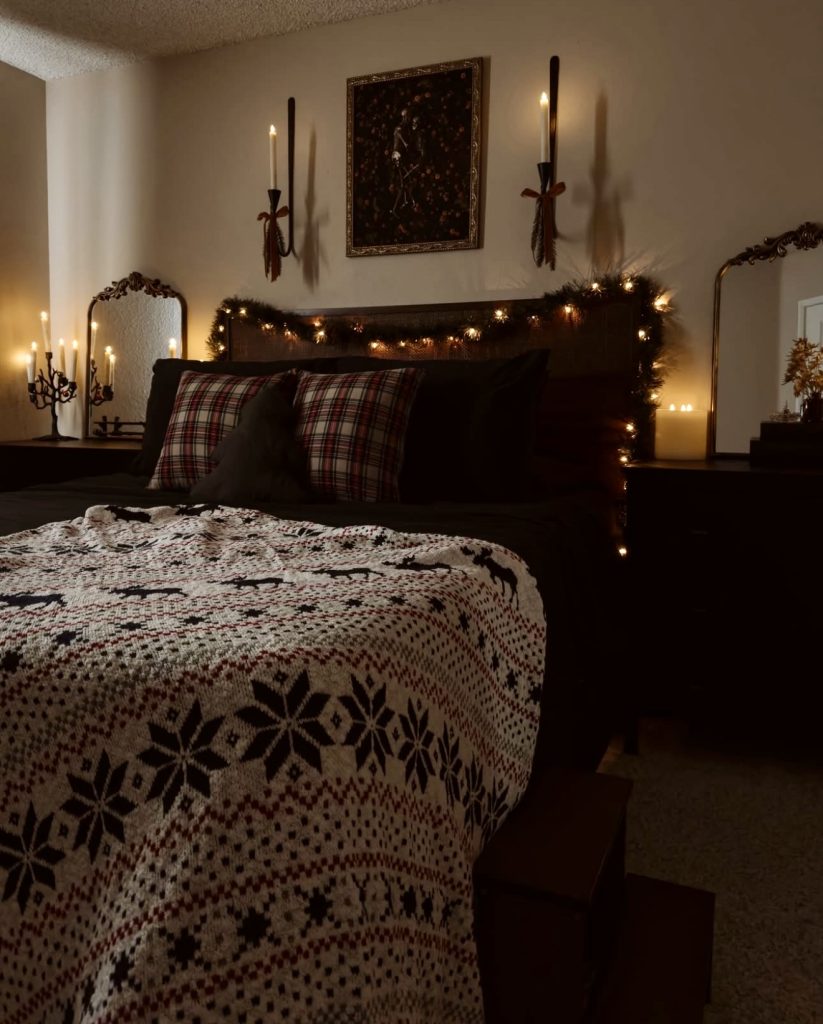Not all holiday bedrooms need to be bright and colorful. This design embraces deep blacks, plaid pillows, and soft candlelight to create a dramatic yet cozy atmosphere. A quilt featuring reindeer and snowflake motifs ties the look to the season, while twinkling garlands soften the space. Perfect for those who enjoy bold, editorial-style decor, this room blends traditional holiday elements with modern sophistication, proving that festive can also be artistic and unique.