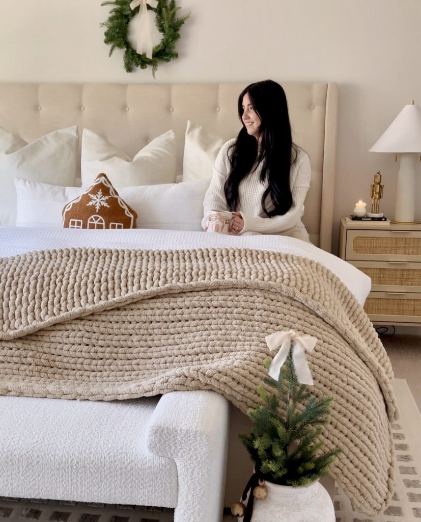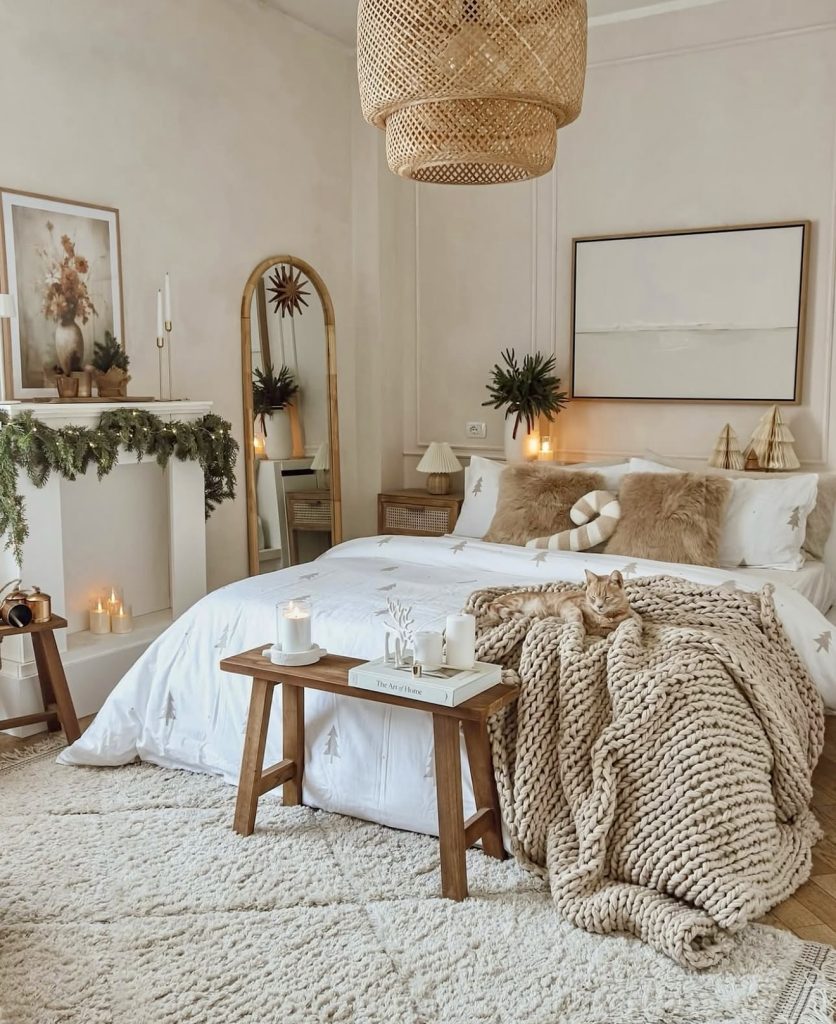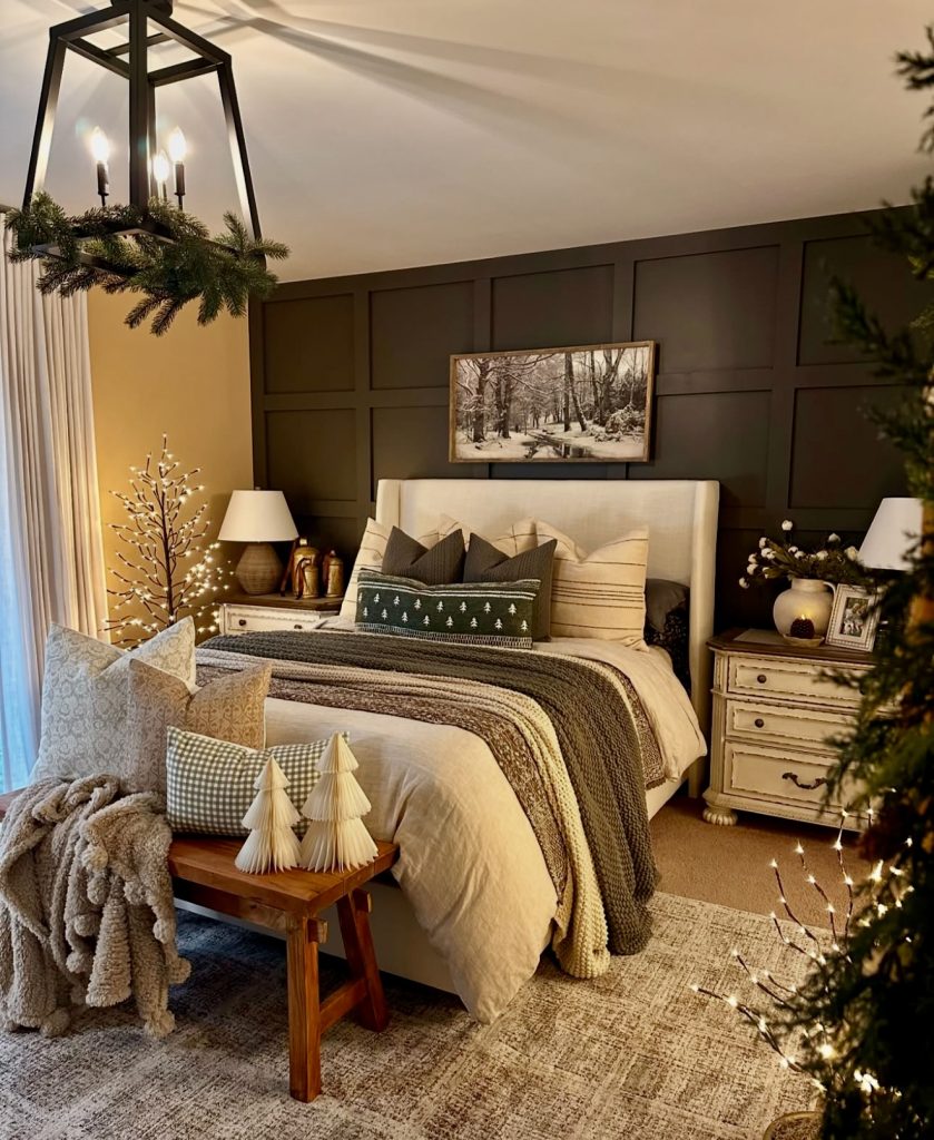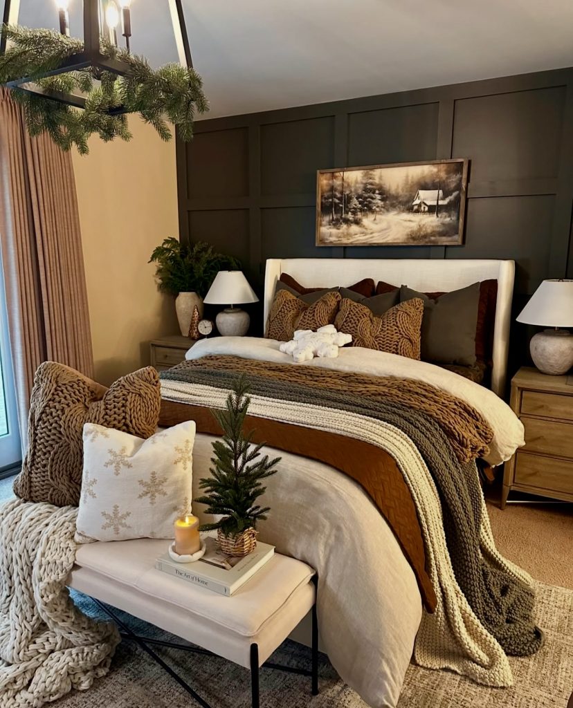 This bedroom embraces earthy hues and rich browns layered with warm neutrals to create a grounded, inviting space. Chunky knit throws and plush pillows enhance comfort, while a small evergreen in a woven basket adds a seasonal touch. A rustic chandelier adorned with greenery and a dark accent wall evoke a farmhouse feel. This blend of classic and contemporary elements proves that simple DIY updates—like swapping pillow covers or adding blankets—can instantly refresh your holiday bedroom ambiance.