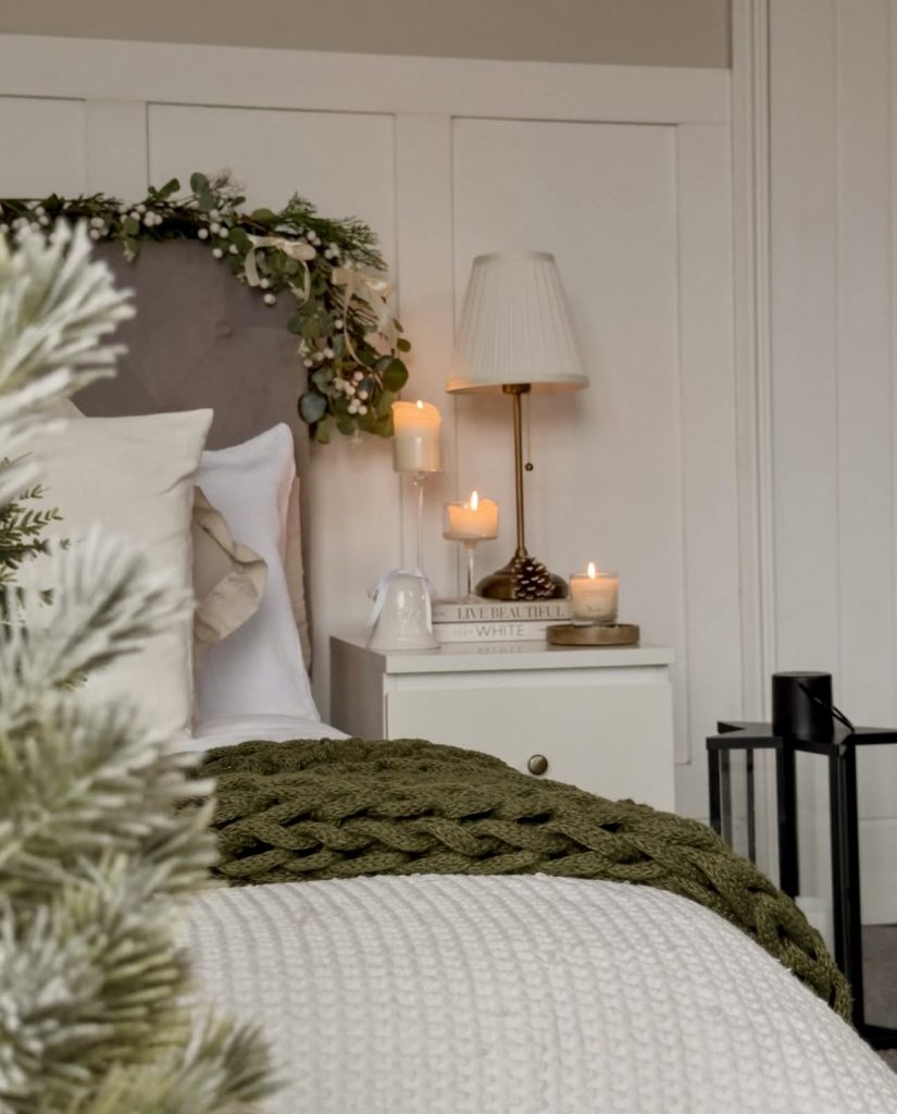 For a lighter, more tranquil holiday look, this bedroom combines muted greens with bright whites. A chunky knit blanket at the foot of the bed adds texture and warmth, while a greenery garland draped over the headboard brings natural charm. Candles on the nightstand cast a gentle glow, and frosty accents throughout enhance the cozy vibe. This design shows that a calm palette and natural elements can create a soothing festive retreat without overwhelming the senses.