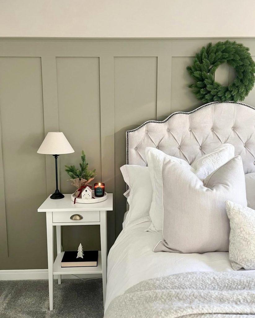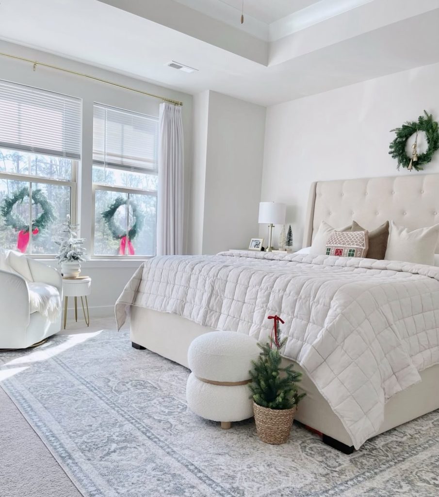For those who prefer subtlety, this design uses muted tones with green wreaths to introduce holiday spirit. Crisp white bedding and tufted upholstery form the base, while a candle and small evergreen on the nightstand add warmth. This style suits small rooms perfectly, showing how a few well-placed accents can create a cozy festive feel without clutter.