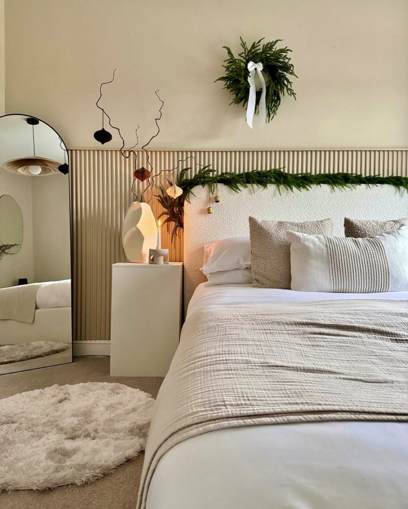 Blending modern simplicity with holiday charm, this design uses a sprig wreath tied with satin ribbon and a garland draped across the headboard to introduce seasonal greenery. Neutral-toned bedding forms a soft foundation, while sculptural vases and small candles add subtle elegance. This style is perfect for minimalists who want to infuse their space with festive cheer through easy, DIY-friendly accents.