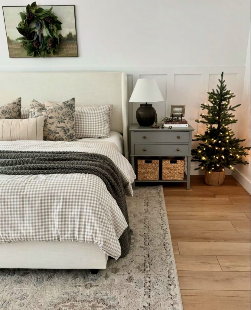 This design transforms a small room into a festive retreat with minimal effort. A simply decorated Christmas tree by the bedside glows softly with string lights. Gingham and toile pillows complement timeless white and neutral bedding, creating a cozy, inviting atmosphere. The best part? This setup is easy to dismantle, proving that you don’t need a large space or budget to enjoy the magic of holiday bedroom decor.