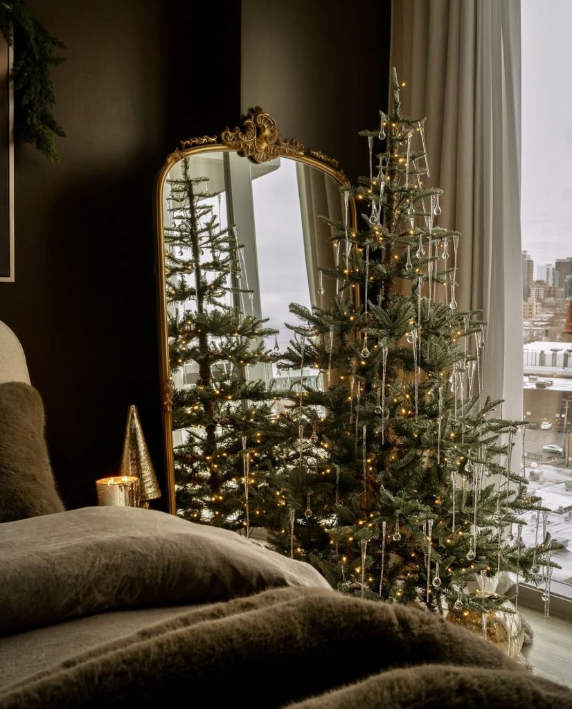 This design is all about atmosphere. A tall tree near a floor-length mirror doubles the sparkle of string lights and ornaments. Dark walls and plush bedding create a luxurious, moody vibe—an elegant holiday interpretation perfect for city apartments. The addition of candles softens the space, making it a sophisticated yet cozy seasonal retreat.