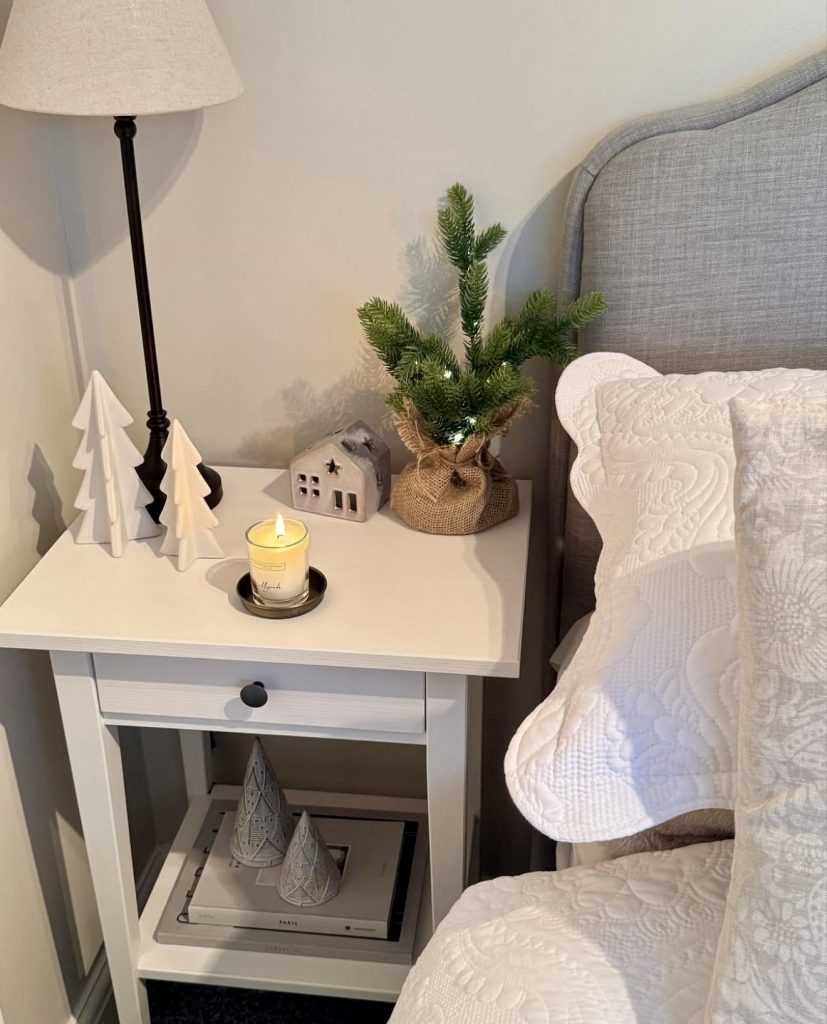Not every holiday bedroom needs a large tree. Sometimes, the smallest accents shine brightest. This look features a mini evergreen wrapped in burlap, small paper trees, and a glowing candle on the nightstand. White quilted bedding highlights these details, while the soft light creates a personal, homey feel. This is a clever, budget-friendly way to make a bedside table festive, especially in limited spaces.