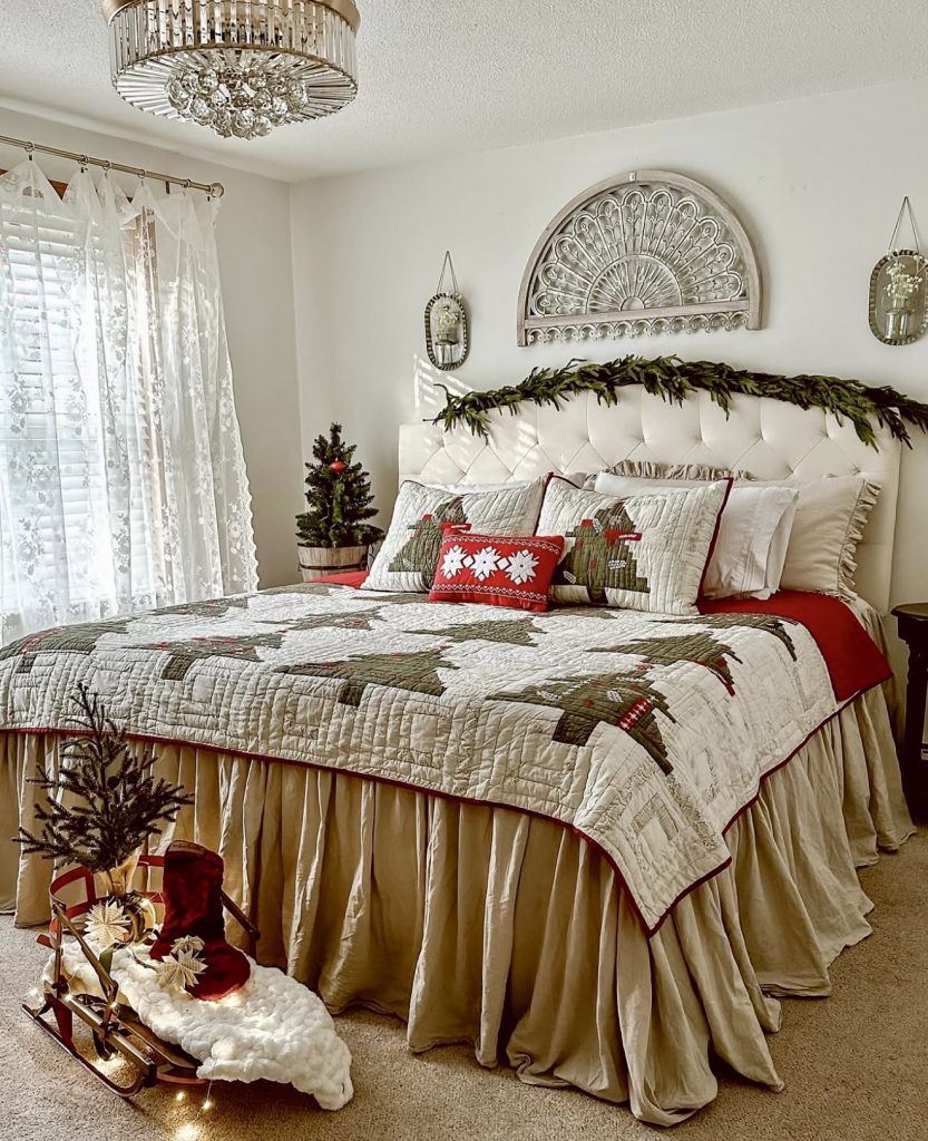 A classic holiday quilt brings nostalgic charm to this bedroom. Featuring a tree pattern with red and green pillows, the space instantly feels cheerful. A garland draped over the tufted headboard adds natural freshness, while a small tree and decorative sleigh at the foot of the bed complete the rustic farmhouse look. This style evokes the warmth of handcrafted family heirlooms and cozy holiday traditions.