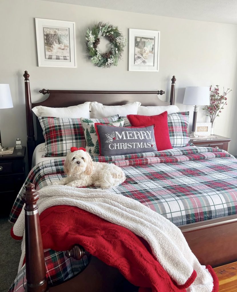 This look combines preppy plaid with traditional holiday cheer. Red and white bedding sets the stage, while a “Merry Christmas” pillow adds a vibrant focal point. Minimal wall decor, including a small wreath and framed art, keeps the focus on the bedding. A playful touch is added by a cozy pet lounging on the bed, making the space feel even more inviting. This joyful style is easy to recreate with DIY plaid bedding or festive pillow covers.