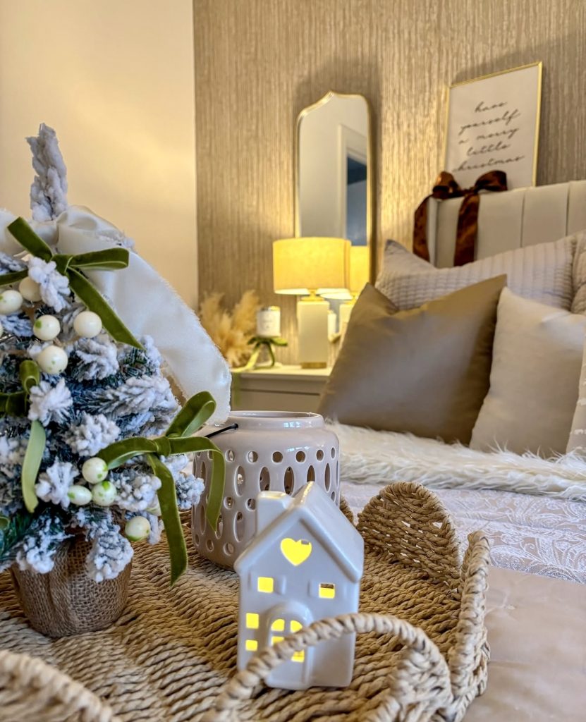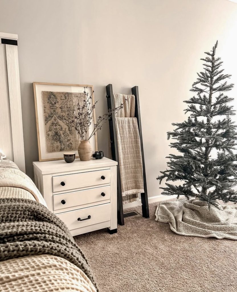 This intimate design uses a small frosted tree in a woven tray, a glowing lantern, and a candle to create a cozy centerpiece. Neutral tones and matching bedding keep the room welcoming without overwhelming the senses. Perfect for small spaces, this simple DIY approach proves that subtle details can foster a relaxed, festive atmosphere.