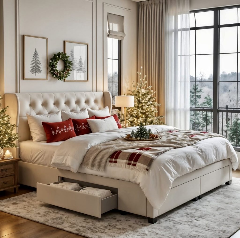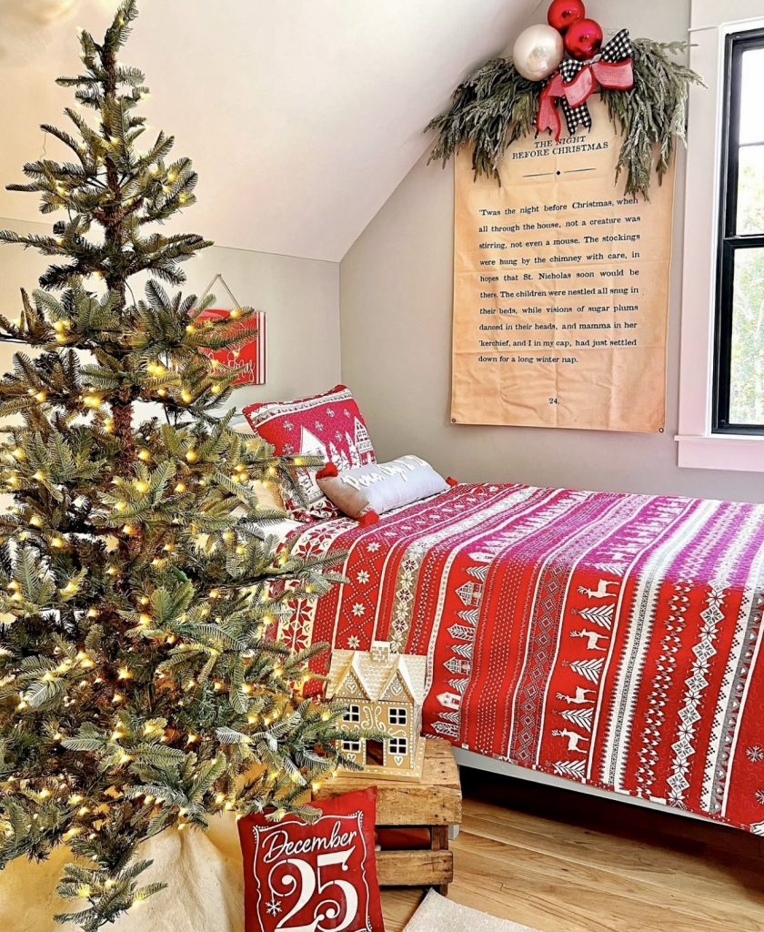 Overflowing with holiday spirit, this bedroom features bright red bedding adorned with trees, snowflakes, and reindeer. A large wall art piece, a glowing Christmas tree, and a pillow marked with December 25 add warmth and fun. This lively style is perfect for kids’ rooms or guest bedrooms where a bold, cheerful look is desired. It’s also highly DIY-friendly—simply swap out bedding and accents to refresh the space. This design blends cozy comfort with festive energy for those who love vibrant holiday decor.