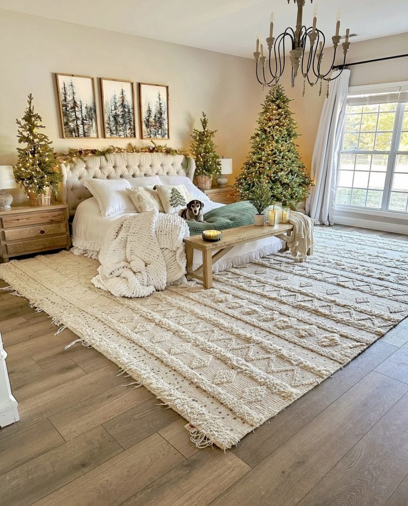 For those who love to go all out, this bedroom features several Christmas trees surrounding the bed. A tufted bedhead, layered throws, and oversized rugs add richness and comfort, while chandeliers and artwork elevate the style. This blend of farmhouse coziness and urban holiday flair is dramatic yet approachable, with simple touches like greenery garlands and candles that anyone can recreate at home.