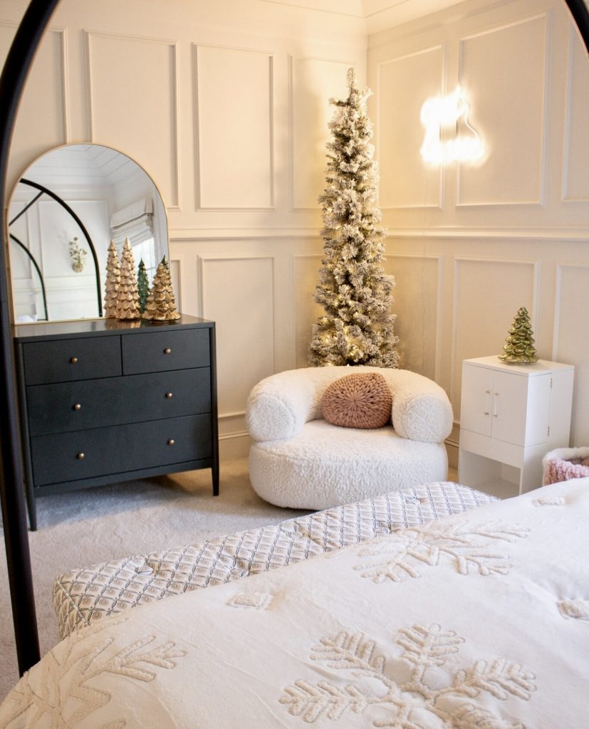 This design showcases the power of a white backdrop. A frosted Christmas tree with warm lights and golden tabletop trees brighten the space. Snowflake-patterned bedding ties the theme together, while a boucle chair adds softness and warmth. This playful yet elegant setup is perfect for small rooms seeking a fresh holiday update.