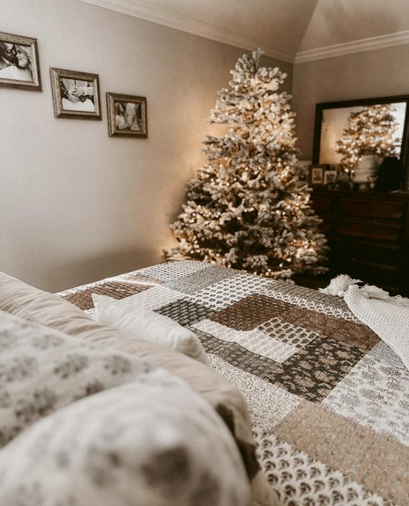 This design features a flocked tree shimmering beside a bed dressed in a patchwork quilt. The combination of natural textures and warm lighting creates an intimate farmhouse feel. It evokes the sensation of a spontaneous holiday getaway where every detail matters. For a budget-friendly approach, using quilts and vintage materials is a smart DIY way to transform your bedroom into a festive retreat.